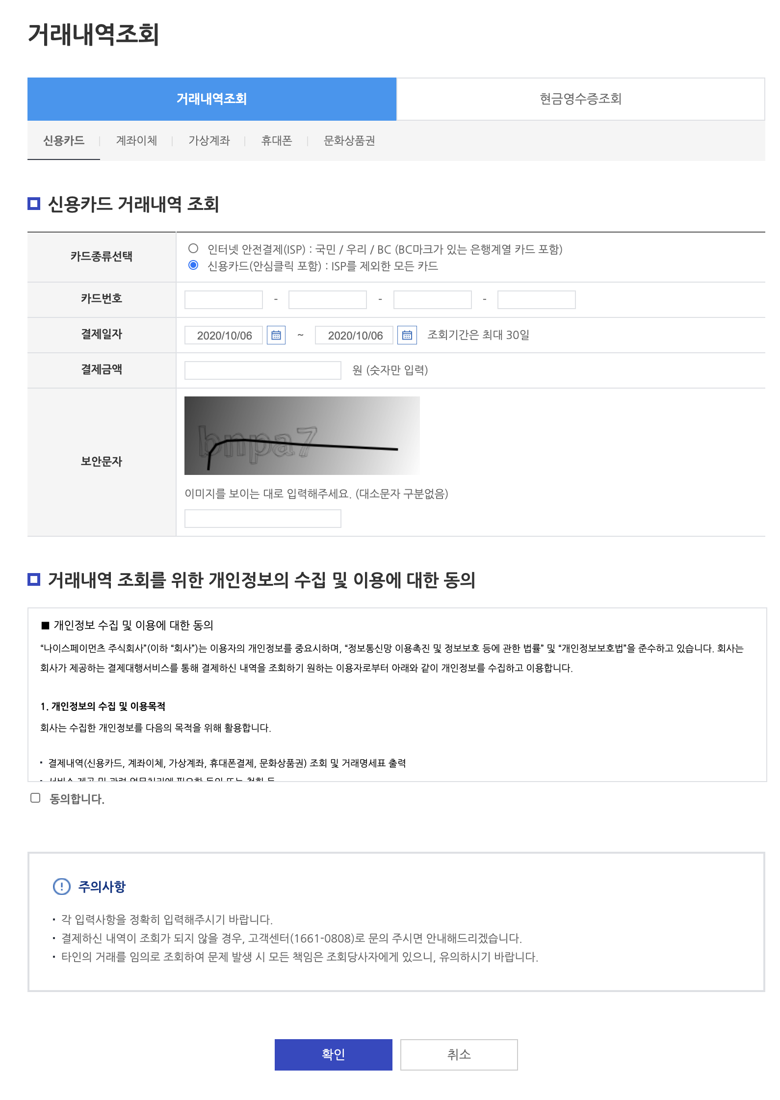 카드종류, 카드번호, 결제 일자를 입력하면 2,3분 뒤에 아래에 표가 나타난다.
