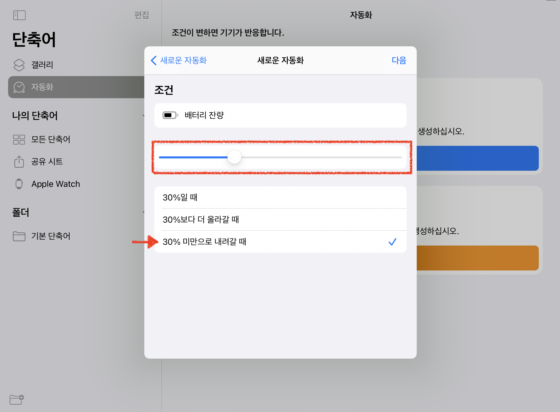3. 알림 받기 원하는 배터 잔량 수치를 지정(스크롤 조정), % 미만으로 내려갈 때 선택
