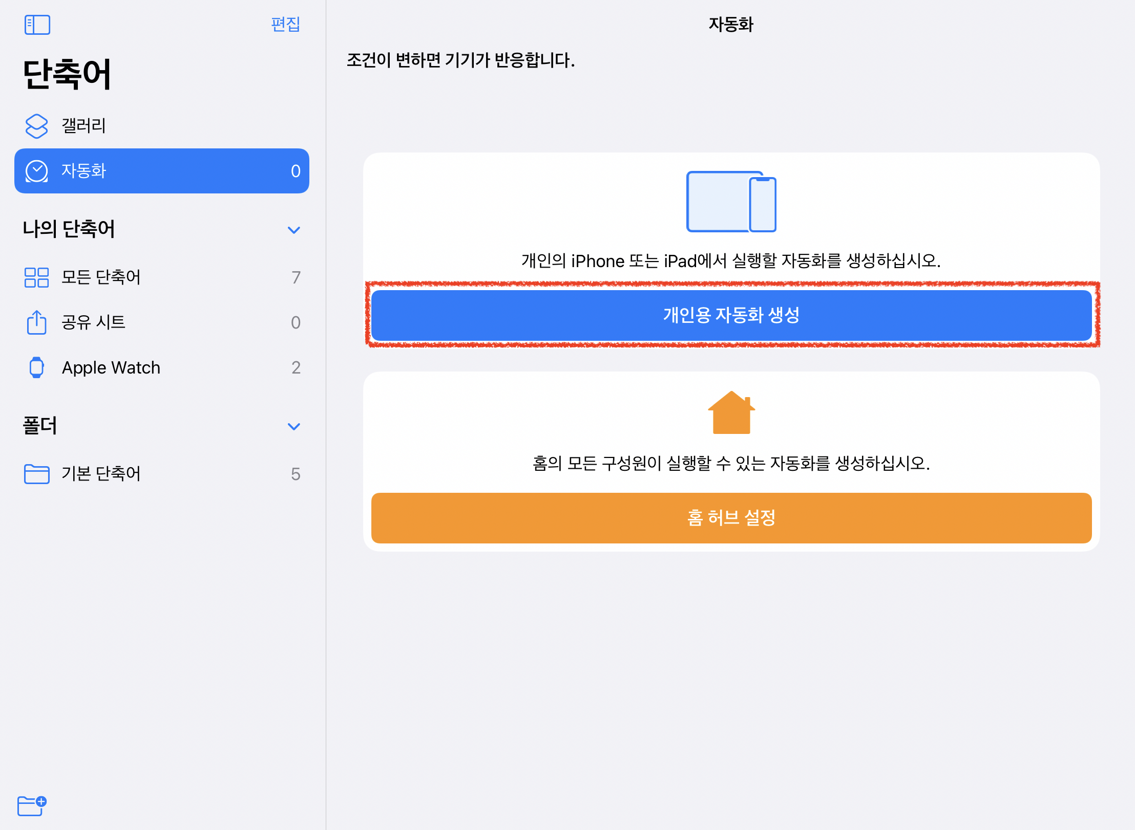 1. 단축어 앱 실행 > 개인용 자동화 생성 선택