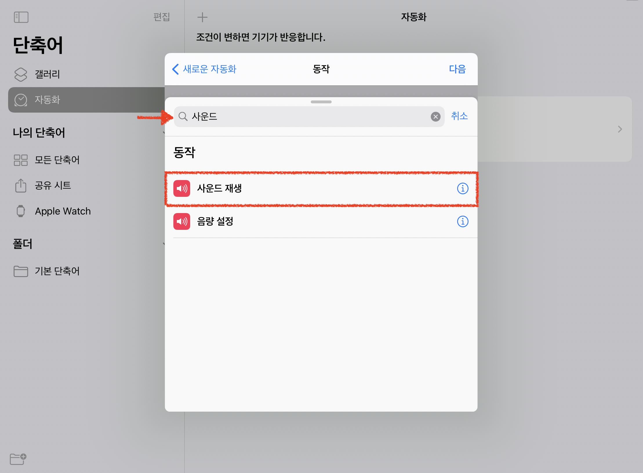4. 검색창에 사운드 를 검색한 후 사운드 재생을 선택