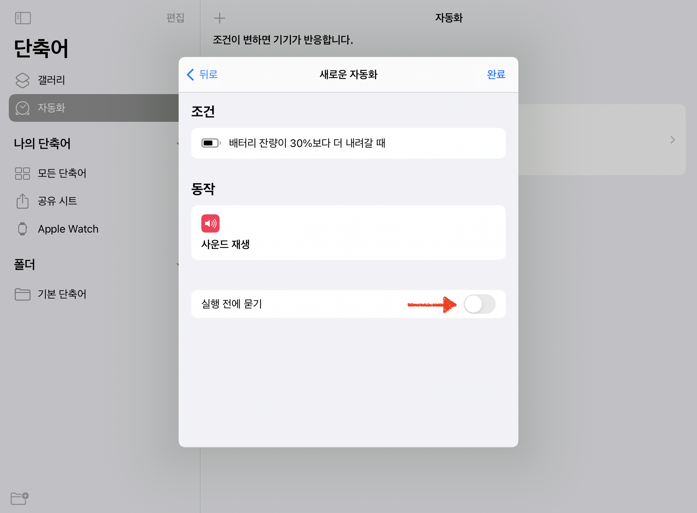 8. 자동화로 설정한 조건이 되면 알림 소리와 함께 메시지가 나타난다.