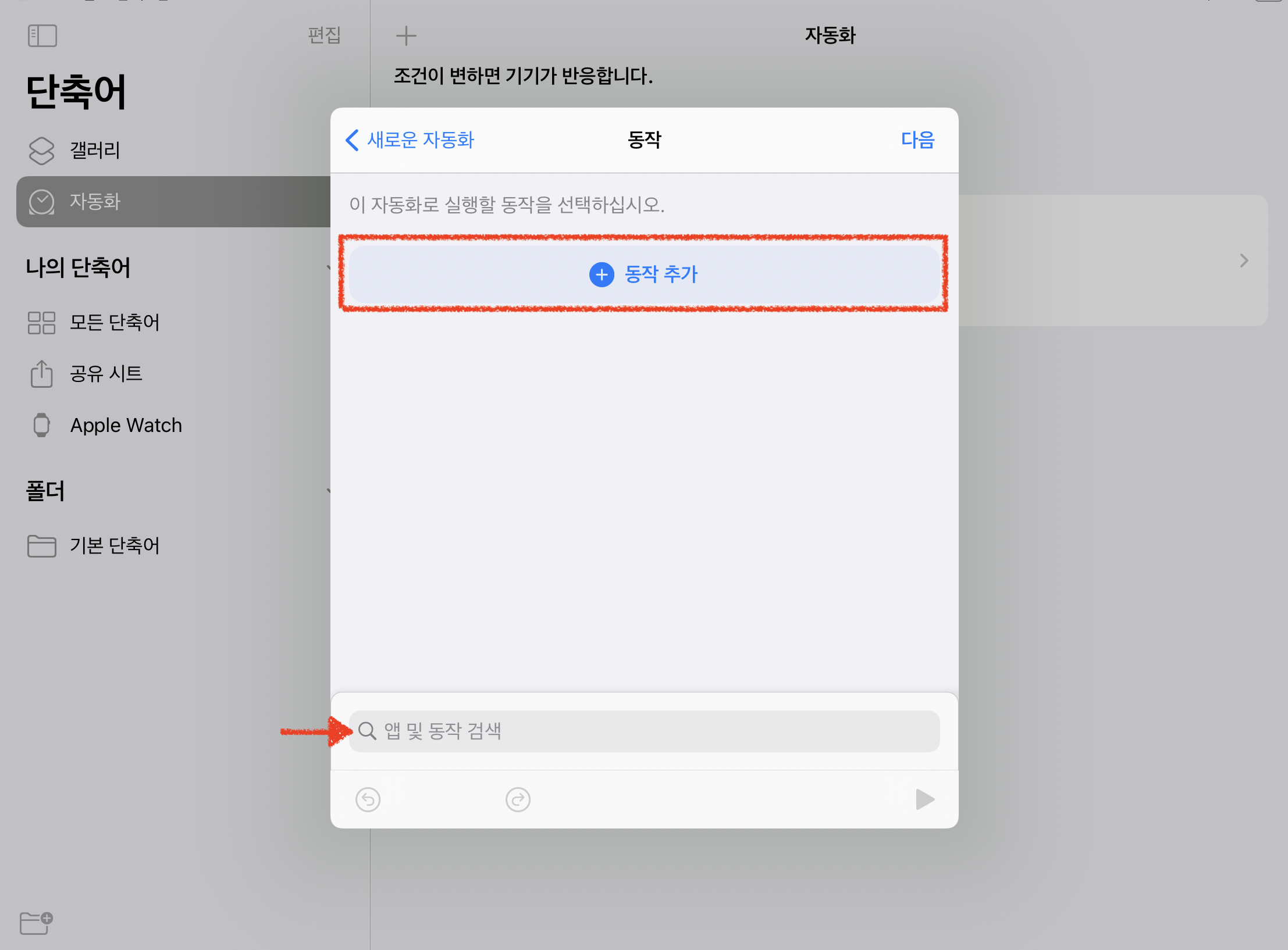 3. + 동작 추가를 선택해서 목록에서 선택하거나, 아래 앱 및 동작 검색을 통해 원하는 실행을 선택