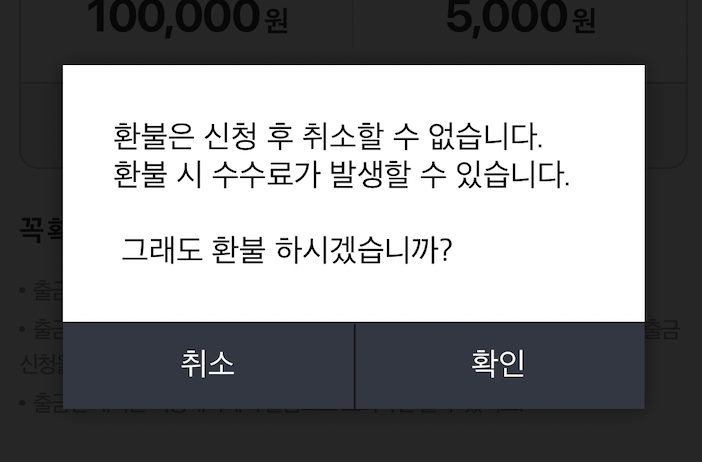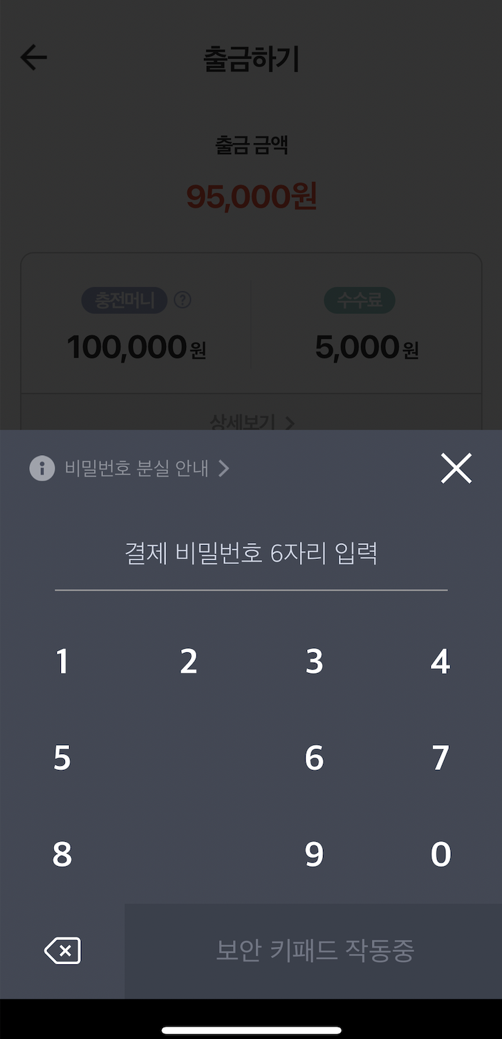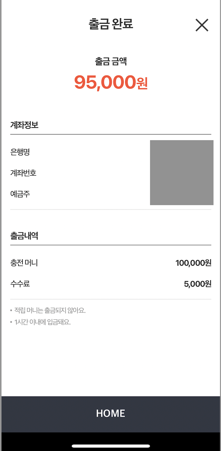 - 10만원인 경우 수수료 5천원을 제외한 95,000원이 출금된다.