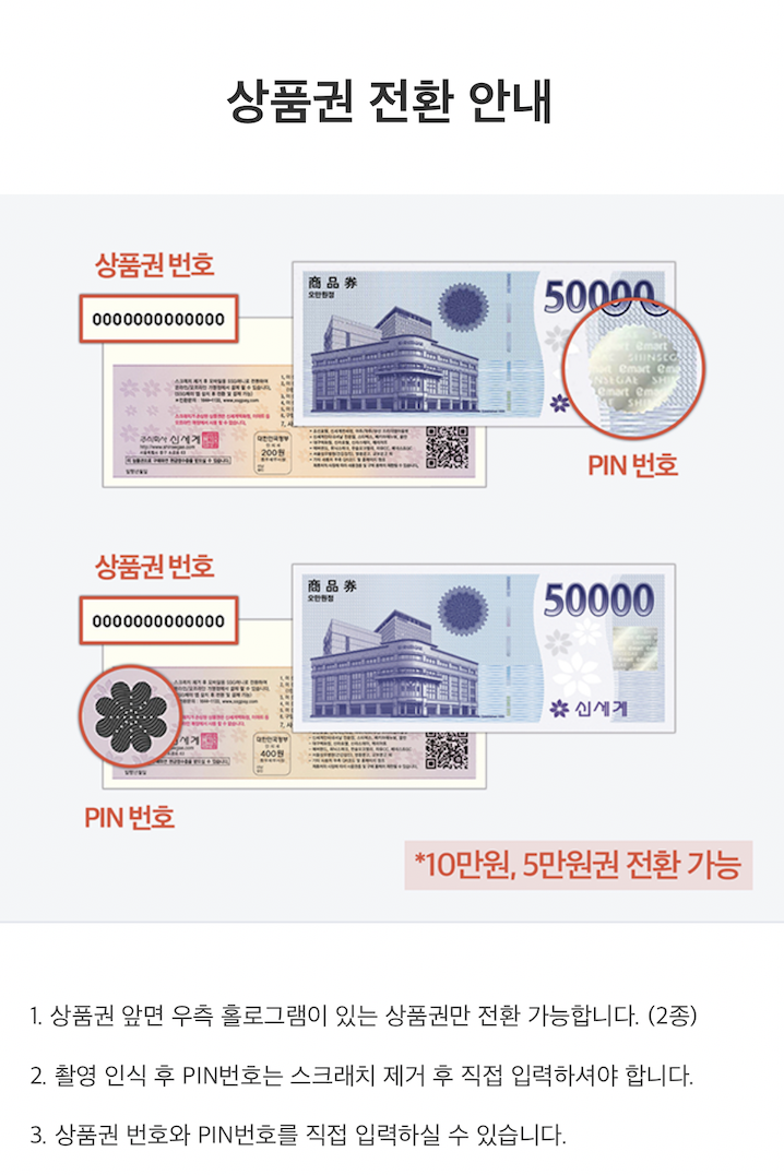 - 상품권 디자인에 따라 PIN번호 홀로그램 위치가 다를 수 있다.
