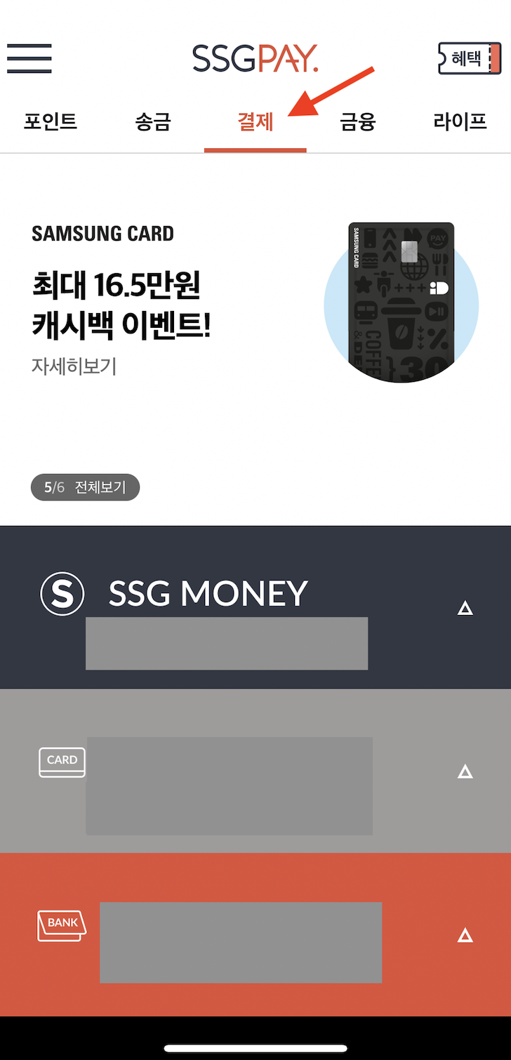 <충전하기> 2. SSGPAY 앱에 로그인 후 "결제" 메뉴를 선택