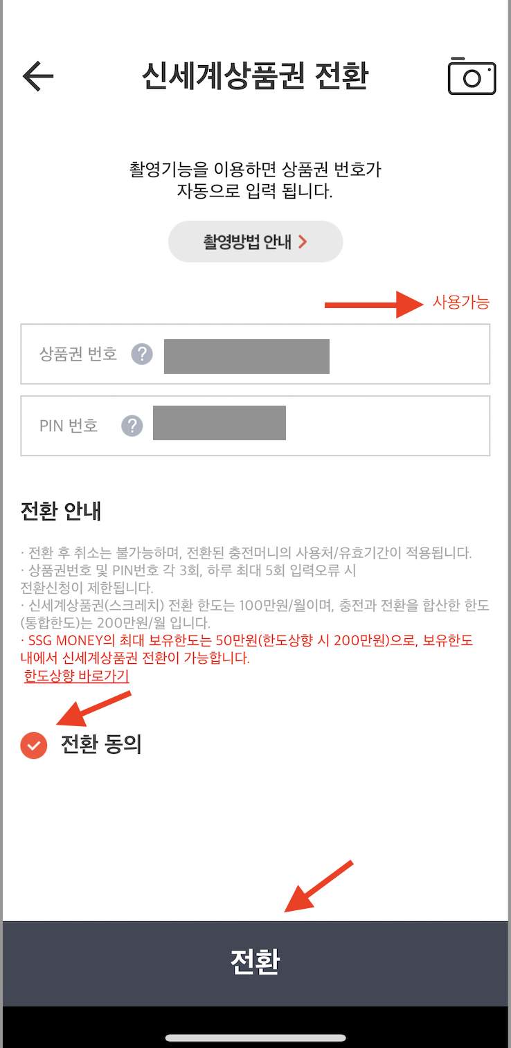 <충전하기> 4. 신세계 상품권 번호, PIN 번호 입력