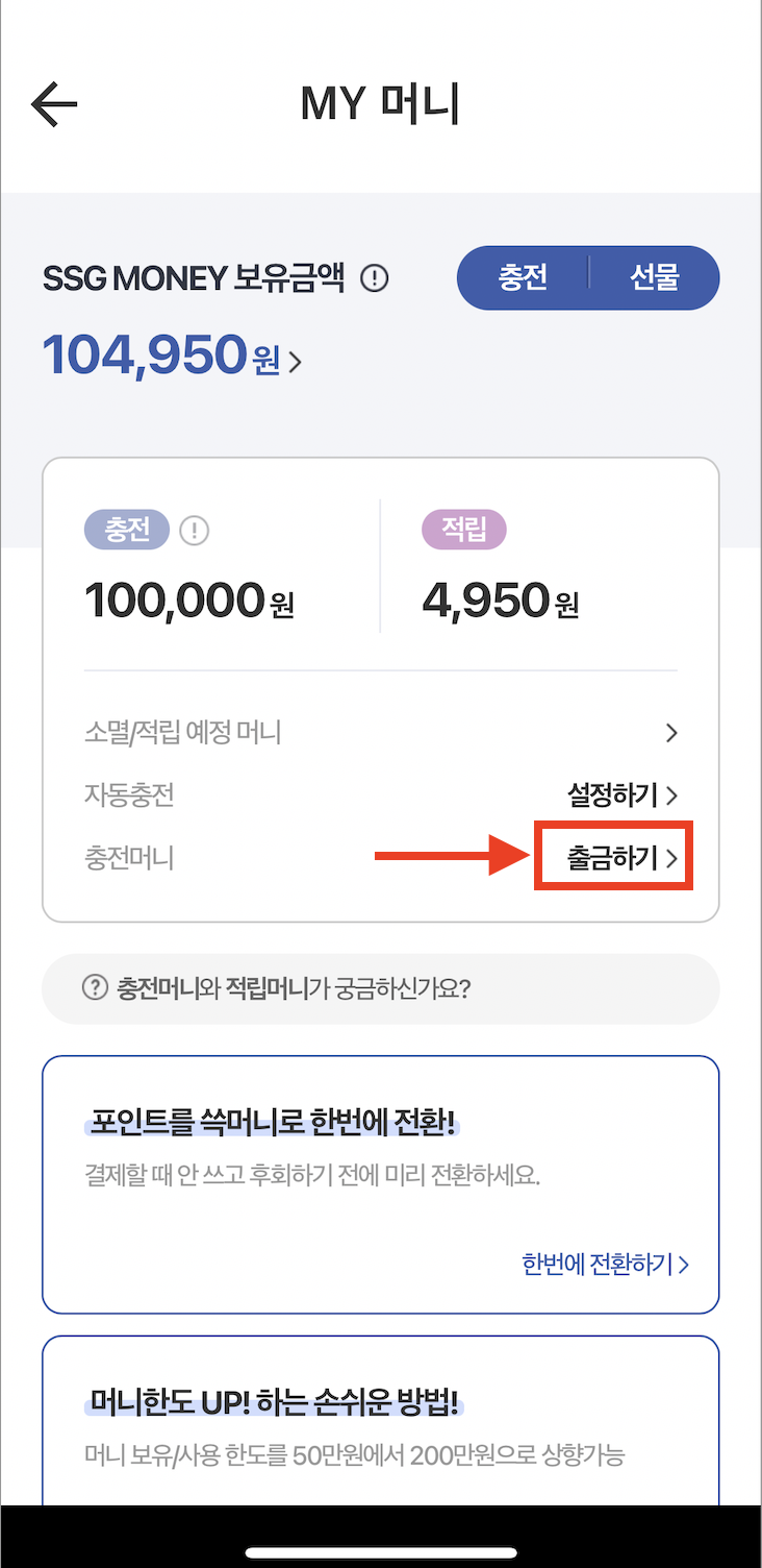 2. 충전된 SSG MONEY(쓱머니) 를 내 계좌로 출금 (수수료 5%)
