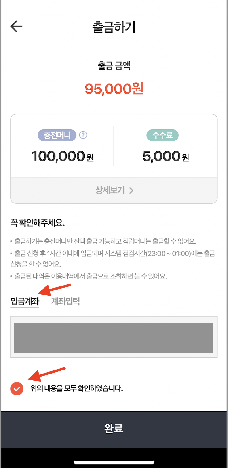 - 출금 계좌가 맞는지 확인하고 아래 "위의 내용을 모두 확인하였습니다." 항목을 체크한다. 그리고 아래 "완료" 메뉴를 선택한다.